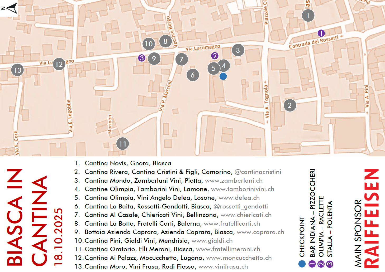 Il partecipante riceverà la tasca portabicchiere, il calice ufficiale Biasca In Cantina, il pass ROSSO e la cartina con indicate le varie postazioni.